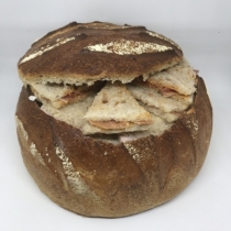 pour 10 à 12 personnes boule de campagne garnie de rillettes de porc, mayonnaise maison jambon blanc , mousse de foie de canard, paté de foie gras aux girolles , pesto jambon serrano